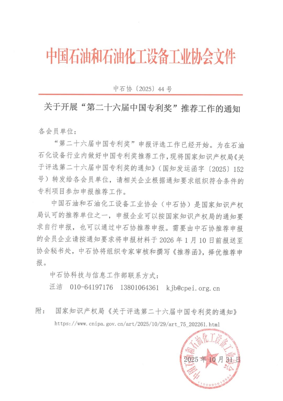 关于开展“第二十六届中国专利奖”推荐工作的通知